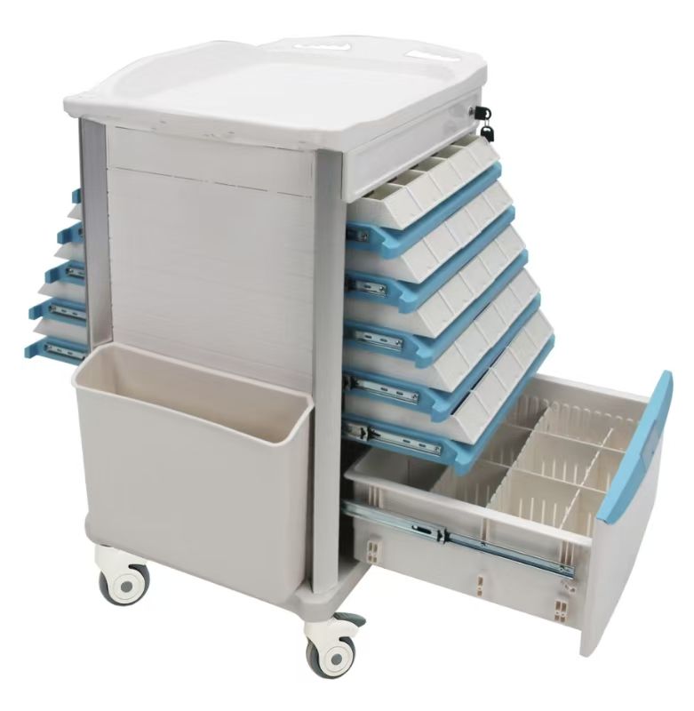 Pour médicament avec tiroir, étagère, porte-déchet, bac latéral, tige porte-sérum, et support pour ordinateur portable.