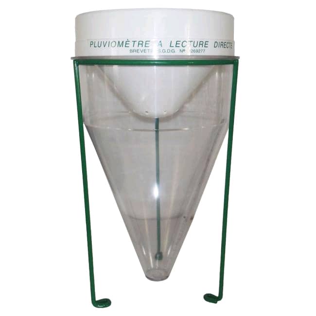 Descriptif du pluviomètre à lecture directe Dimensions : 22.5 cm x 43.5 cm Il est formé de deux parties en matière plastique s'emboitant l'une dans l'autre et d'une éprouvette. 1- La partie supérieure opaque, en forme d'entonnoir à fond perforé, sert à recueillir la pluie sur une surface de 400 cm2, très exactement définie grâce à son bord biseauté.